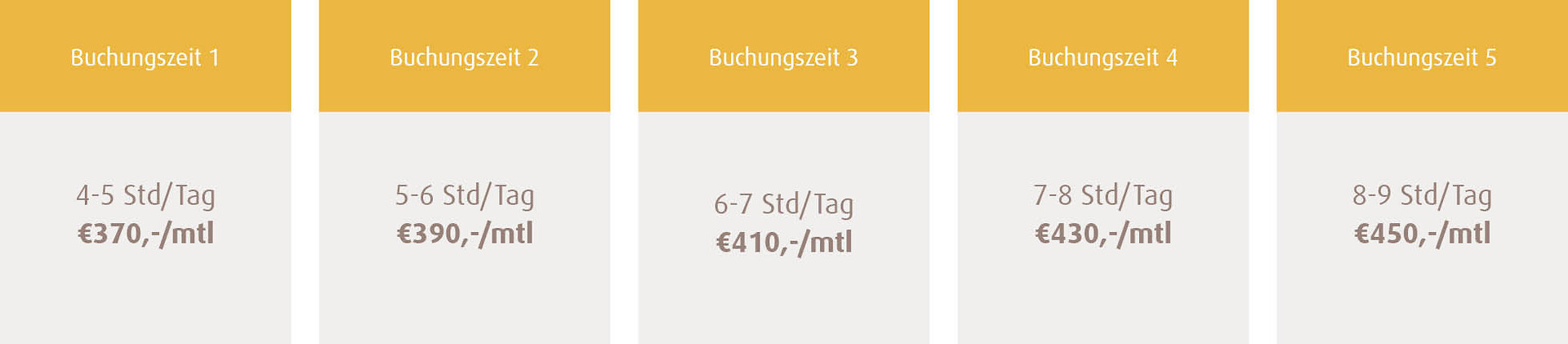 Oben finden Sie unsere Buchungszeiten und die entsprechenden Gebühren. Die Beiträge werden 12 Monate im Jahr erhoben. Darin sind die Kosten für die Zwischenmahlzeiten (Frühstück und Nachmittagsimbiss) bereits enthalten.
